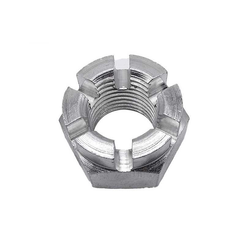 Mur mahkota yang mengunci secara positif ini dengan slot banyak digunakan dalam peralatan industri berat, seperti mesin cetak, sistem penyampaian dan poros berputar, dll.