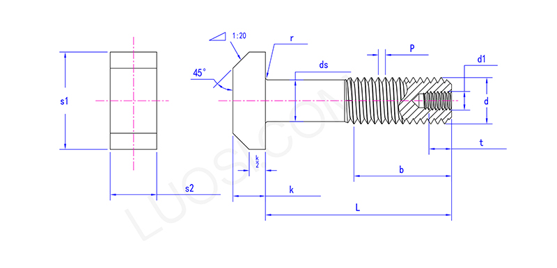Kepala baut Tenk T yang tereduksi dengan lubang mirip dengan belah ketupat dan dapat macet di t-slot untuk diperbaiki dan tidak berputar. Bagian tengah sekrupnya menjadi lebih tipis, yaitu, "batang menyusut", dan lubang juga telah dibor di bagian bawah sekrup. Interiornya berongga.